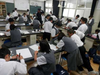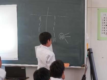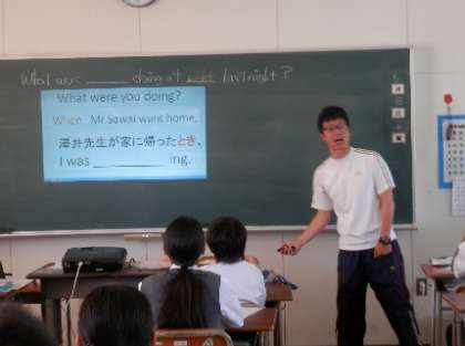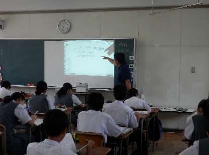 今年度の目標の一つでもあるICT活用授業づくりの研究が始まっています。現在は、週に1回、授業づくり支援員の先生が来校され、各先生方の授業を参観しながら、今後のICT導入に向けて、相談ができるような取り組みを進めています。6月からは各教室で、タブレットを使ってインターネット接続ができるようになります。今日は、2年生の英語の授業でプロジェクターを使い、工夫した授業が行われていました。