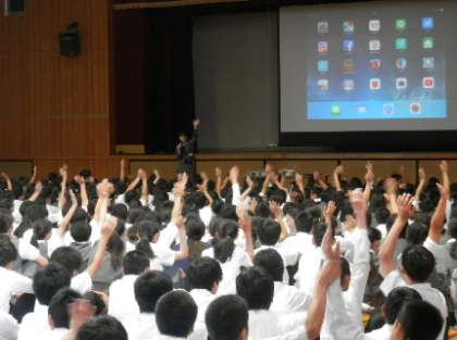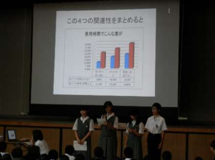 初めに、生徒会が昨年実施したアンケート調査から見えてきた課題について、全校生徒に基調提案し、外部講師先生の講話を聞きました。2時間目には各教室においてアンケート調査を含めた感想文を書いてもらいました。今日の講話とアンケート調査結果を参考に、今後、生徒会が中心となって「中学生の適切なスマートフォンの使い方」について検討していきます。 -