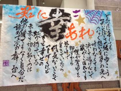 出発準備に少し時間がかかりましたが、午前9時30分 一泊移住に出発しました。宿泊場所は、滋賀県の希望ヶ丘文化公園 「青年の城」です。バスは順調に走り、午前11時に宿舎に到着しました。 バスに乗り込むよ↓宿舎に掲示されている、高校の作品の一部です。↓ -