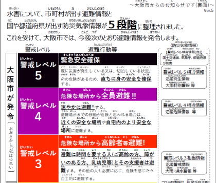 なお、河川氾濫に伴う臨時休業等につきましては、気象庁等から出される防災気象情報(警戒レベル○相当情報)ではなく、大阪市(大阪市長)が発令する避難情報に基づき、ご判断いただきますようお願いします。