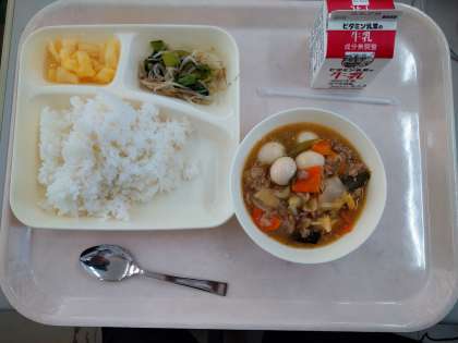 本日のメニューは、八宝菜、チンゲンサイともやしのしょうがあえ、パインアップル(カット缶)、ごはん、牛乳でした。