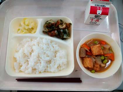 本日のメニューは、ちくわのいそべあげ、あつあげとさといものみそ煮、あっさりキャベツ、ごはん、牛乳です。