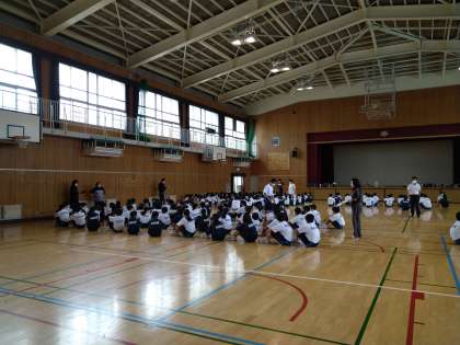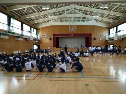 1・2限目、1年生学年練習が行われました。昨日の雨の影響で、体育館での練習となりました。