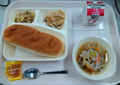 本日は、金時豆の中華おこわ、中華スープ、ツナと野菜のオイスターソースいため、コッペパン、アプリコットジャム、牛乳でした。