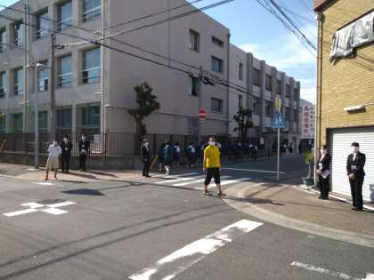 登校時の様子です。今日から教育実習が始まります。登校時のあいさつ運動に参加してくれました。 -