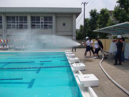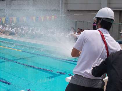 6月13日の土曜授業で、避難訓練を行いました。城東消防署に指導いただいて、2・3年生は水消火器を使っての消火訓練、1年生はプールサイドに移動して、可搬式ポンプを使っての消火訓練を行いました。プールサイドでは勢いよく飛ぶ水しぶきにみんな驚いていたまし。どちらも上手にできていました。