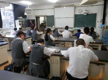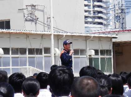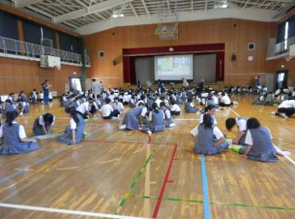 土曜授業で防災学習に取り組みました。1時間目は全校生徒が体育館に入り、防災・減災にかかわる講話を校長先生から聞きました。身近なところに川が流れている私たちの生活環境を知り、防災意識を高め、減災対策に努める。2時間目は教室からの避難訓練と、各学年に分かれて、それぞれ訓練を受けました。 -