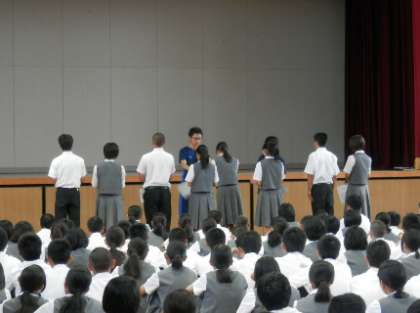 先週行った体育大会では、新記録がたくさん出ました。本日は、3年生の学年集会で、その新記録を出した人に賞状の伝達を行いました。 -