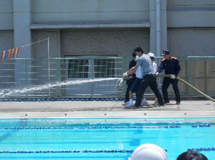 1年生は、可搬式ポンプの操作の仕方を4人一組で学びました。はじめに先生方が手本を示した後、放水訓練の実技体験を行いました。