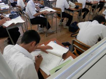 3年生が府下統一のチャレンジテストに挑戦しました。5時間連続で国・社・数・理・英、5教科のテストになりました。マークシート方式(一部記述式)の解答用紙となっていましたが、記述式の部分に少し未記入の解答用紙がありました。予定では、テストの返却は、9月頃になりそうです。 -