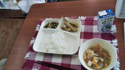 本日の給食のメニューは、いわしてんぷら、すまし汁、豚肉とさんどまめのいためもの、ご飯、牛乳でした。