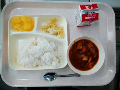 本日の給食のメニューは、ハヤシライス、キャベツのゆずドレッシング、りんご(カット缶)、牛乳でした。