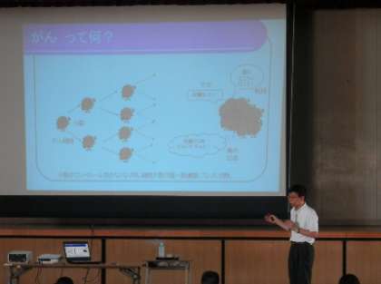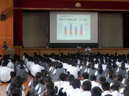 府立成人病センター、がん予防情報センターから中山富雄先生にご来校いただき、3年生を対象に「がん」教育をしていただきました。中学校では、健康の保持増進について保健体育の時間に学習しますが、日本の三大死因の一つである「がん」は、誰しもが発症しうる病気であることをうけ、その病気について詳しく知ることで今後の予防に繋げる大切さを学習しました。自分の健康は自分の手で守りましょう。 -
