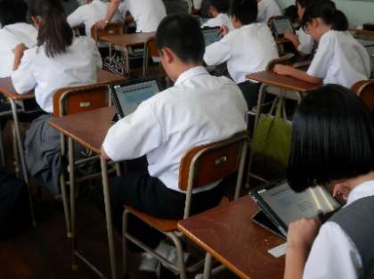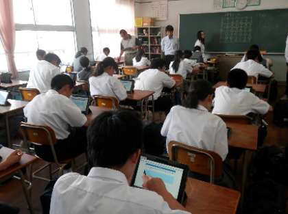 一部、タブレットを使った授業が始まっていますが、そのタブレットを使って使用前のアンケート調査を実施しています。本日は、1年生の2クラスで行いました。 -