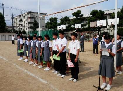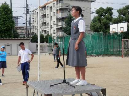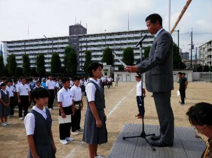 全校集会を行いました。校長から、「明日から始まる学期末の三者懇談会に臨む姿勢について」話がありました。また、土日に参加した大会や発表会でいただいた表彰状の伝達を行いました。ラグビー部が畑中杯(2年生大会)において優勝。剣道部が女子個人の部で大阪府3位と8位の賞状をいただきました。放送部からは、NHK杯全国中学校放送コンテスト「朗読部門」でみごとに入賞しました。この結果、剣道部は、8月に行われる近畿大会に出場、放送部は全国大会へ進出することになりました。これからの頑張りに期待しています。 -