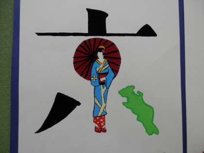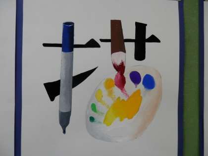 校舎内の壁面には様々な掲示物が貼られています。中には、生徒が製作したポスターや作品がたくさん展示されています。素晴らしい作品をぜひご鑑賞ください。2年校舎階段踊り場には、美術の作品を掲示しています。 -