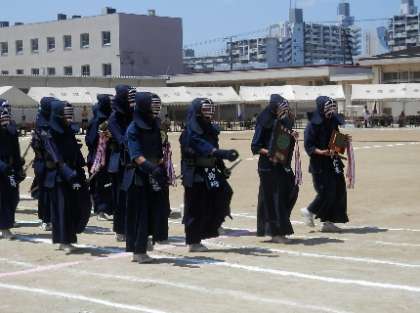 7月22日(金)の大阪府の剣道大会(団体戦)において、本校の女子チームが見事に優勝。男子チームは、惜しくも3位に終わりました。男子も大阪市の大会から考えると飛躍的な結果を残しました。この結果、女子は、8月に行われる全国大会(長野県)へ大阪代表として出場します。残された準備期間を更なる目標を掲げ、挑戦して下さい。 6月の体育大会で行進する剣道部↓ -