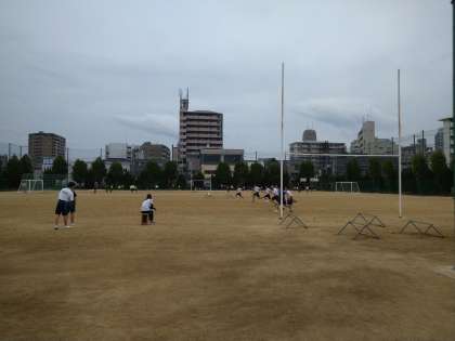 グランドでは、陸上部とサッカー部が活動をしています。何とか雨も降らず、活動中です。
