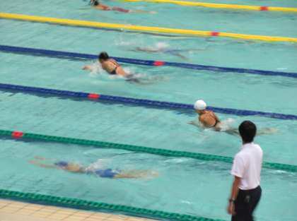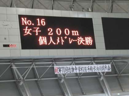 近畿中学校総合体育大会水泳競技の部が門真市ラクタブドームで開催されました。本校から1年生の古田さんが200m個人メドレーに出場。予選を通過し、午後からの決勝レースに進出し、健闘しました。結果は9位でしたが、まだ1年生という事もあり今後が楽しみです。他の水泳部の仲間も全員で応援していました。 -