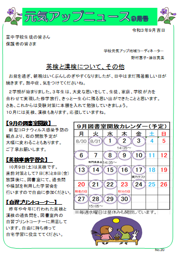 今週より3学年揃っての令和3年度の2学期のスタートとなります。まだまだ暑い日が続きます。水分を多めに持参ください。熱中症対策をしましょう。併せて、引き続き、新型コロナウィルス感染症拡大防止対策をお願いいたします。マスク着用、登校前の検温をお忘れなく。なお、体操服登校といたします。