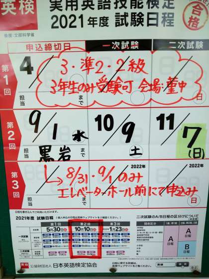(再掲) 実用英語技能検定の受付(3年生対象)