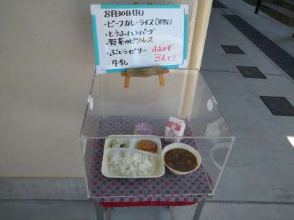 本日の給食は、ビーフカレーライス(米粉)、とうふハンバーグ、野菜のビクルス、ぶどうゼリー、牛乳でした。