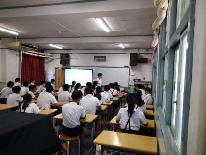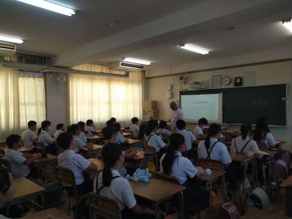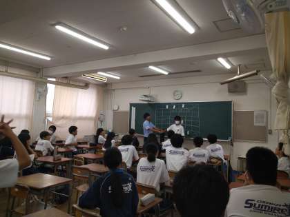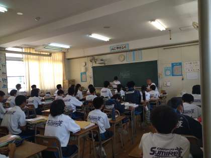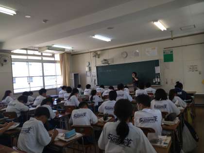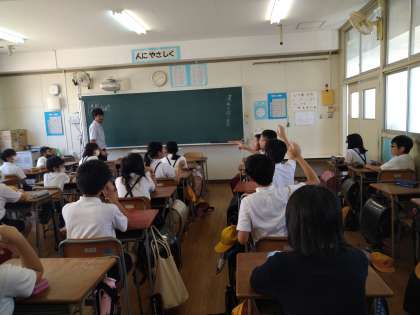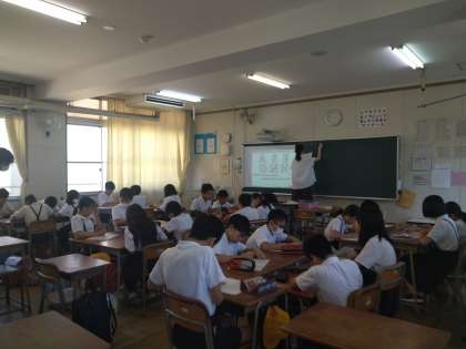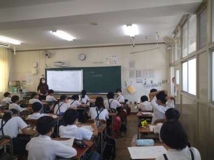 始まる前のリラックスした様子、中学校の先生方とも早く打ち解けました。さぁ、授業が始まりました!