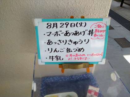 今日の給食は、マーボーあつあげ丼、あっさりきゅうり、りんご(カット缶)、牛乳でした。