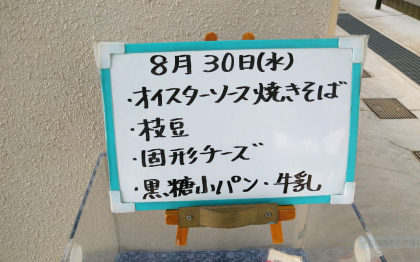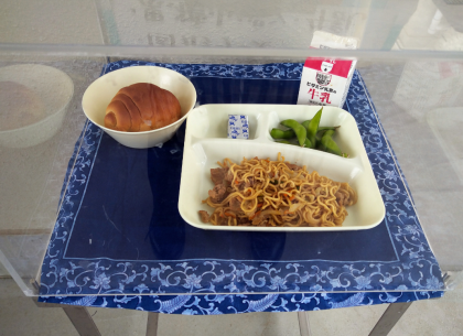 今日の給食は、オイスターソース焼きそば、枝豆、固形チーズ、黒糖パン(1/2)、牛乳でした。
