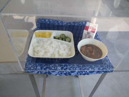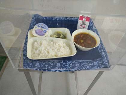 今日のメニューは、ビーフカレーライス(米粉)、野菜のピクルス、ぶどうゼリー、牛乳でした。
