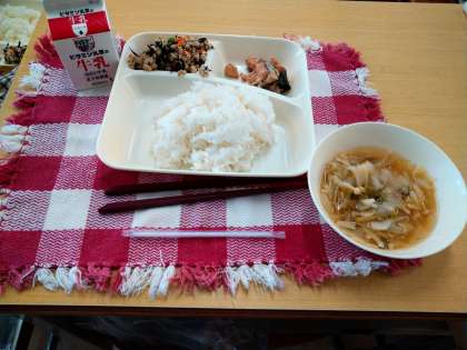 本日の給食メニューは、さけのしょうゆ風味焼き、五目汁、高野どうふのいり煮、ごはん、牛乳でした。