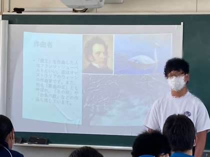 音楽の授業では、学習者端末を活用して、作成したパワーポイントデータをプレゼンしています。テーマは自分の好きな(興味のある)曲についてです。