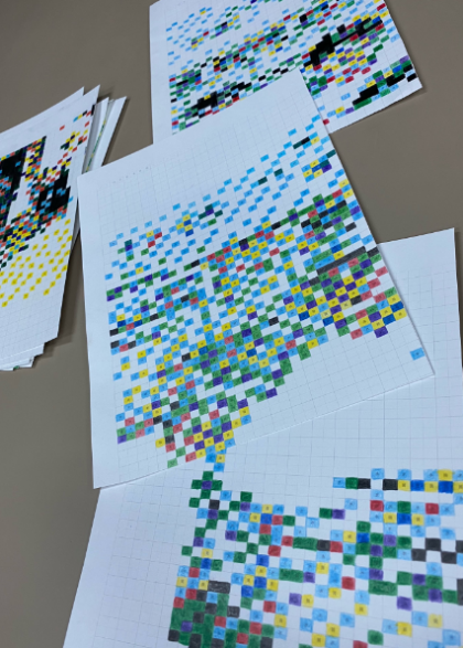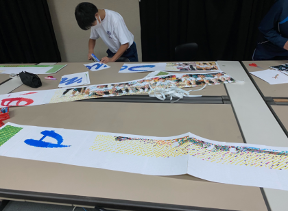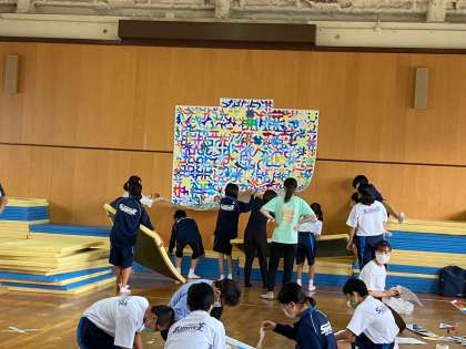 みんなで総合の時間などを使って、色鉛筆で塗ったケント紙をつなげていくと、少しずつ文字や人の形が出来上がっていきます。