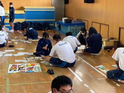 写真は、格技室での各学年の制作の掲示準備です。 -