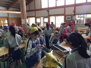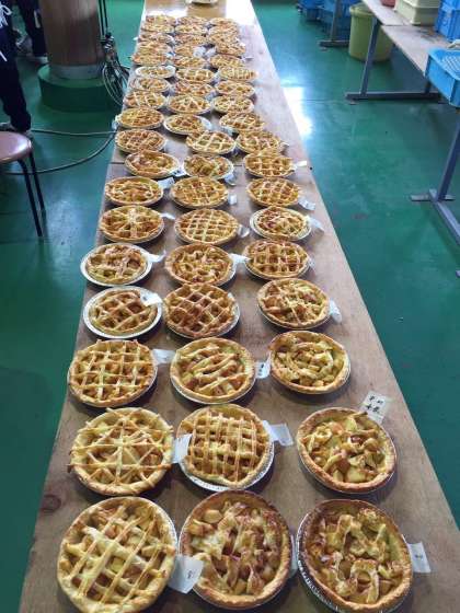 アップルパイが美味しく焼きあがりました。続いてバームクーヘンも作ります。協力して焼いています。