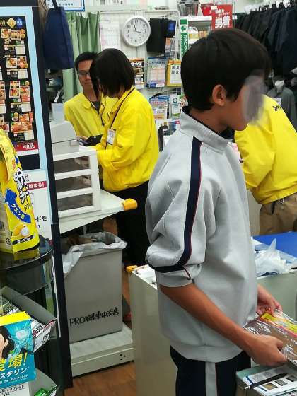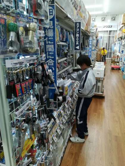 品出しやレジのお手伝い。木材の重さを体験させていただいています。