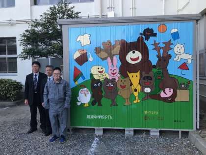 本校卒業生の倉田莞爾くん(平成29年卒)がPTA倉庫の壁面にイラストを描いてくれました。