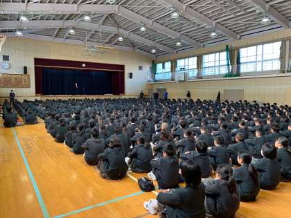 体育館に全校生徒が集まり、今年最後の集会を行いました。