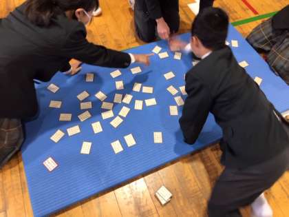 1月17日(金)の5・6限に2年生は百人一首大会を行いました。国語係や学級代表、体育委員が説明や準備を行い、大いに盛り上がりました。
