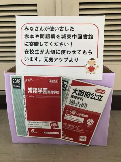 みなさんからいただいた、問題集は、図書館の学習コーナーに置き、後輩たちが勉強したり、高校を調べたりすることに利用します。