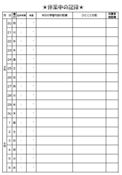 さて生徒の皆さん、休業中の課題はできましたか?まだ休みが続くからと言って残していませんか。休業が延びたことにより学習課題も先生たちで再度計画中です。積み残すことの無いように終わらしましょう。また、休業中の記録はとっていますか。