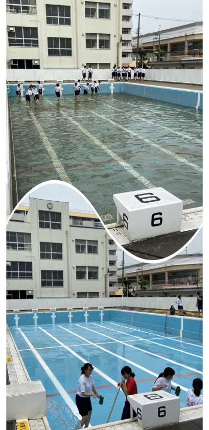本日、野球部・バドミントン部・バレー部の生徒と体育科の教員がプール掃除を行いました。1年間の汚れを丁寧に掃除し、新しくプールがきれいになりました。ありがとうございました。