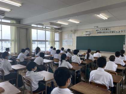 5限の終業式では、教室で静かに校長先生の話を聞きました。短い夏休みですが、8月25日に元気な姿で会いましょう。