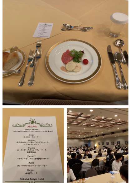 17時に白馬東急ホテルに到着した一行は中庭で全体写真をとり、諸注意を確認した後、部屋に入りました。その後、クラスごとに夕食や入浴を行なっています。