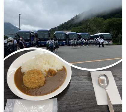 ダムから扇沢駅に到着後、バスに乗車し、ホテルに戻ってきました。今から昼食です。コロッケカレー、カレーはおかわり自由です。