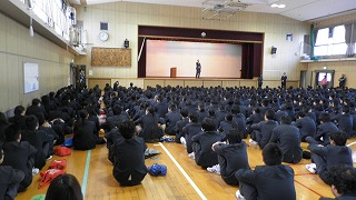 まず、校長先生から、城東区の女子中学生全員に配布された「防犯ブザー」についての説明がありました。いろいろな犯罪に巻き込まれる危険から身を守るためにも、外出・通学の時に、カバンにつけましょう。