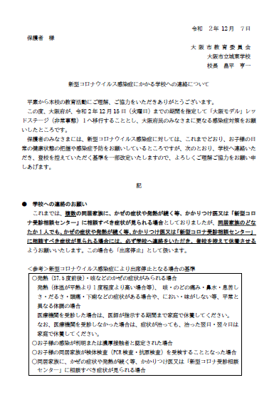 同居家族のどなたか1人でも、かぜの症状や発熱が続く等、かかりつけ医又は「新型コロナ受診相談センター」に相談すべき症状が見られる場合には、必ず学校へ連絡をいただき、登校を控えて休養させるようお願いいたします。
