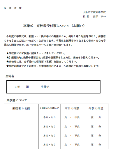 明日の卒業式では、受付票の持参が必要になります。記入していただき、持参よろしくお願いします。