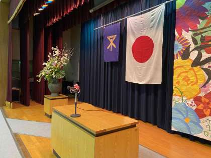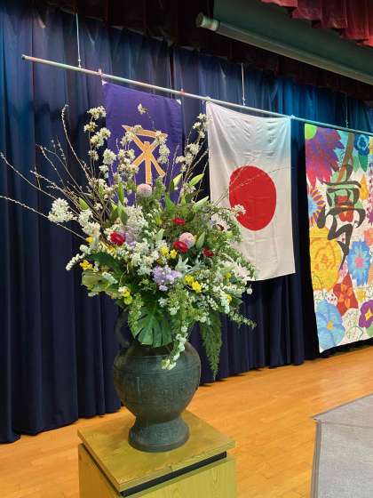 本日、午前中に式場に生花が設置されました。明日の入学式を楽しみしているかのようにたくさんの花が咲いています。
