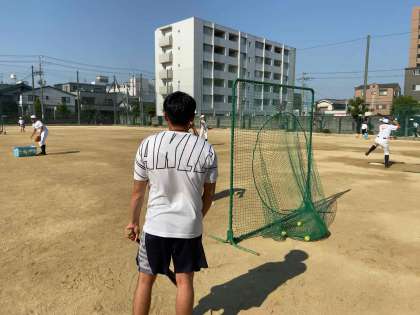 放課後のグラウンドでは部活動が一生懸命行われています。野球部では教育実習生が熱心に野球を教えていました。